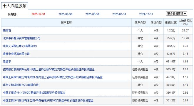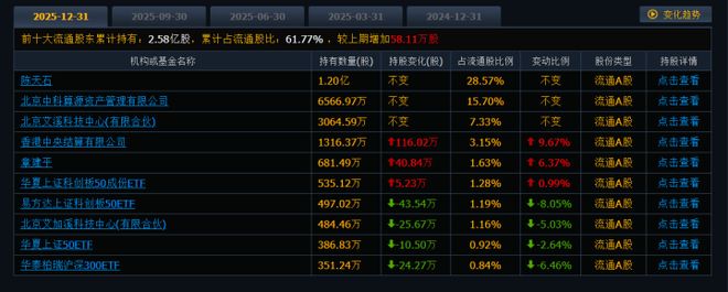 截至2025年12月31日,寒武纪前十大流通股东名单中,有4个席位属于ETF。