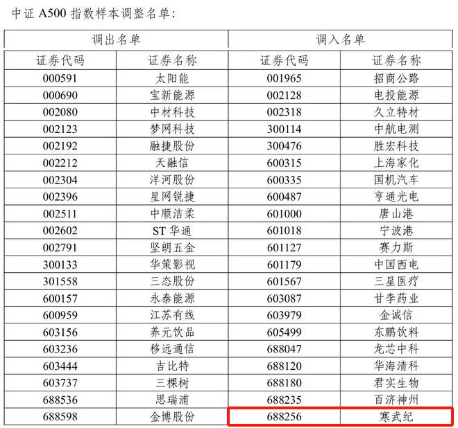 更值得注意的是,去年底,中证A500指数首次进行调仓。此次调仓涉及了21只新股的纳入与剔除。被新纳入的股票里,就有寒武纪。更早些时候,寒武纪还被纳入了上证50指数,一度引起热议。