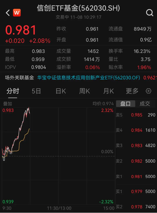热门ETF方面,信创ETF基金(562030)早盘单边上扬,现场内价格上涨超2%,冲击日线四连阳!实时成交额快速突破1300万元,交投活跃!