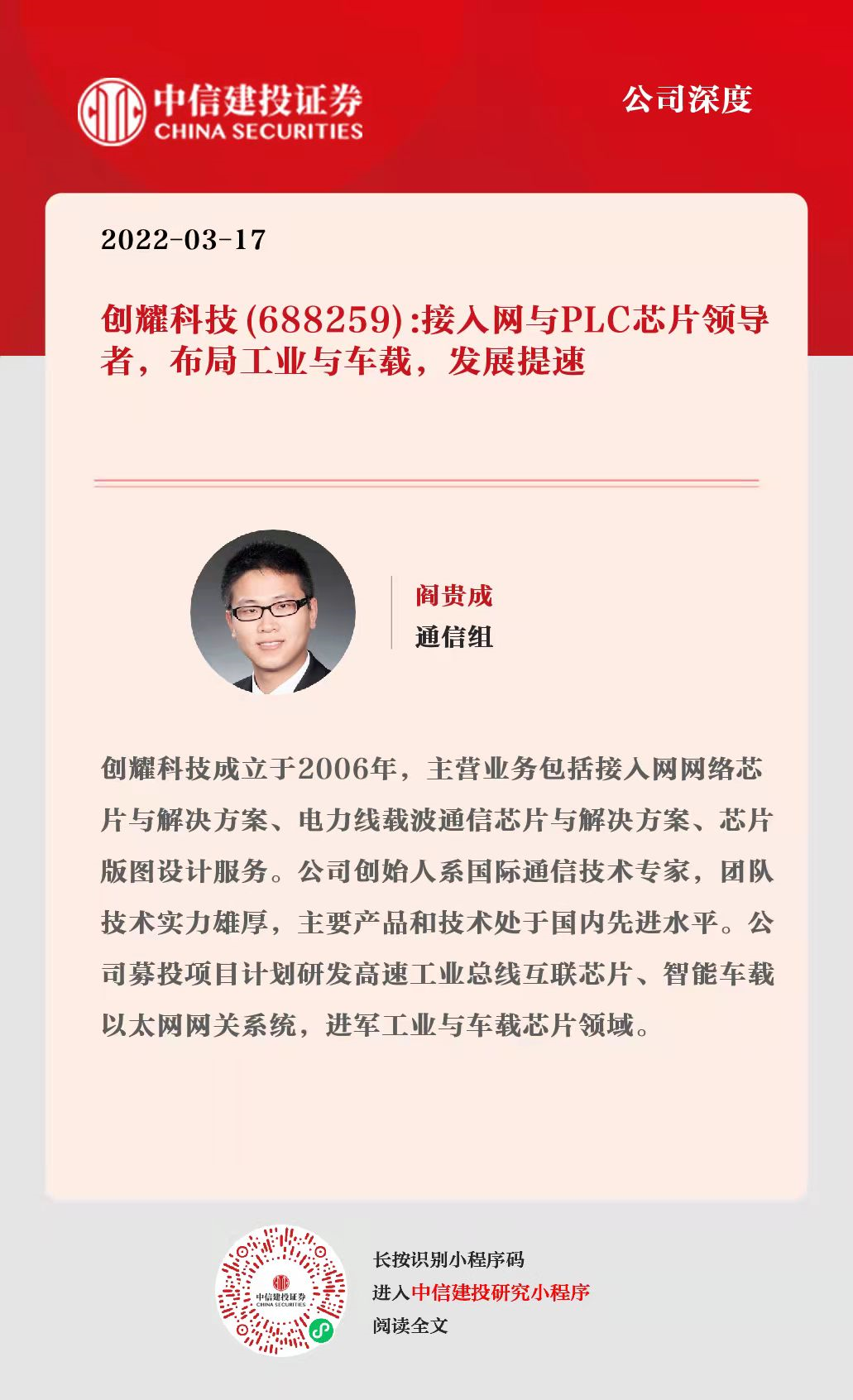 证券研究报告名称:《创耀科技(688259):接入网与PLC芯片领导者,布局工业与车载,发展提速》