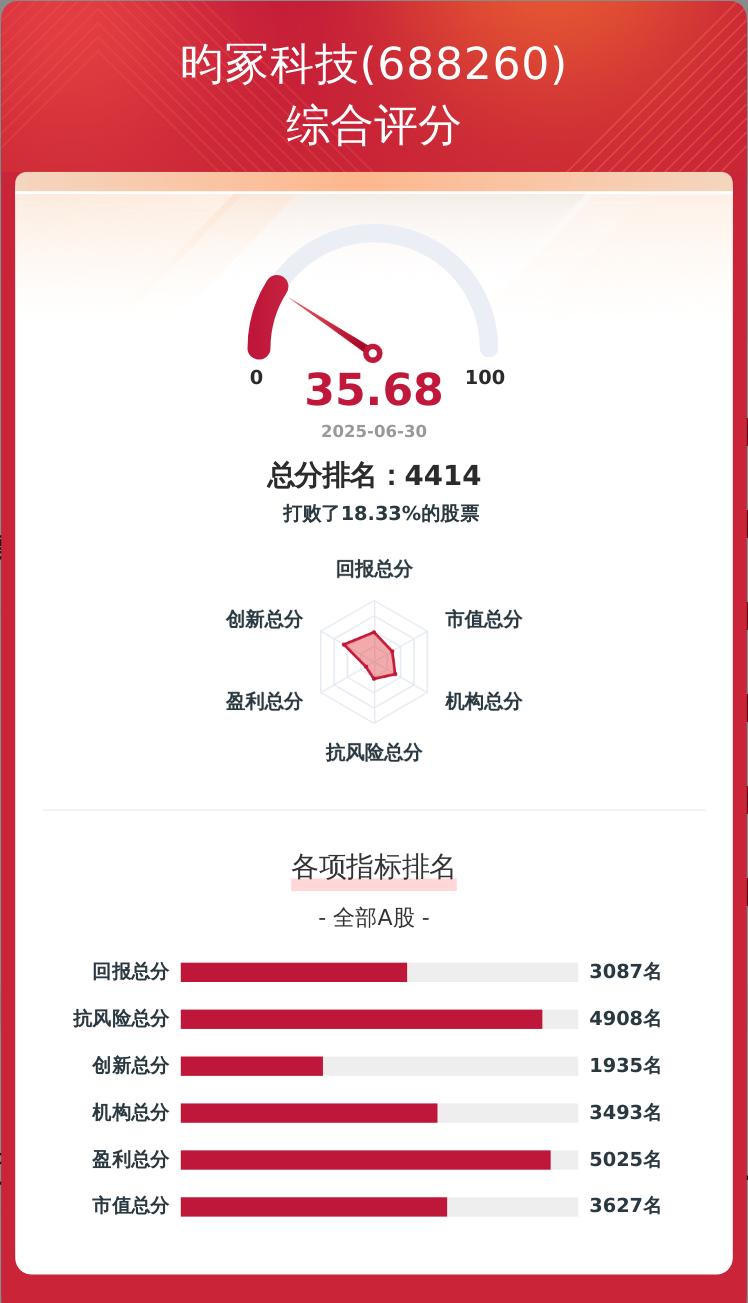 金融界上市公司研究院构建了一套上市公司韧性评价体系,从企业盈利、科技创新、股东回报、经营抗风险、市值表现及机构吸引力六个维度对企业进行量化评分,满分为100分。昀冢科技的韧性评价总分为35.68分,在A股5405家可比上市公司中排名第4414位。