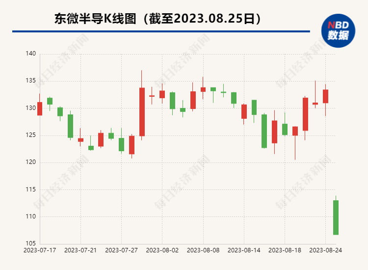 业绩不尽如人意,股价今日也迎来“挫折”,8月25日,东微半导低开低走,小幅震荡后迅速跌停,跌幅20%,报收于106.72元/股,在半导体板块中跌幅领先。