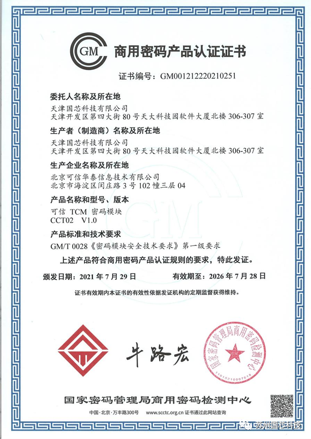 苏州国芯科技股份有限公司(天津国芯科技有限公司为其全资子公司)获取的国家密码管理局商用密码检测中心颁发的“可信TCM密码模块”认证证书如下: