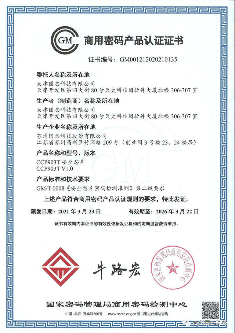 CCP903T安全芯片商密产品认证证书
