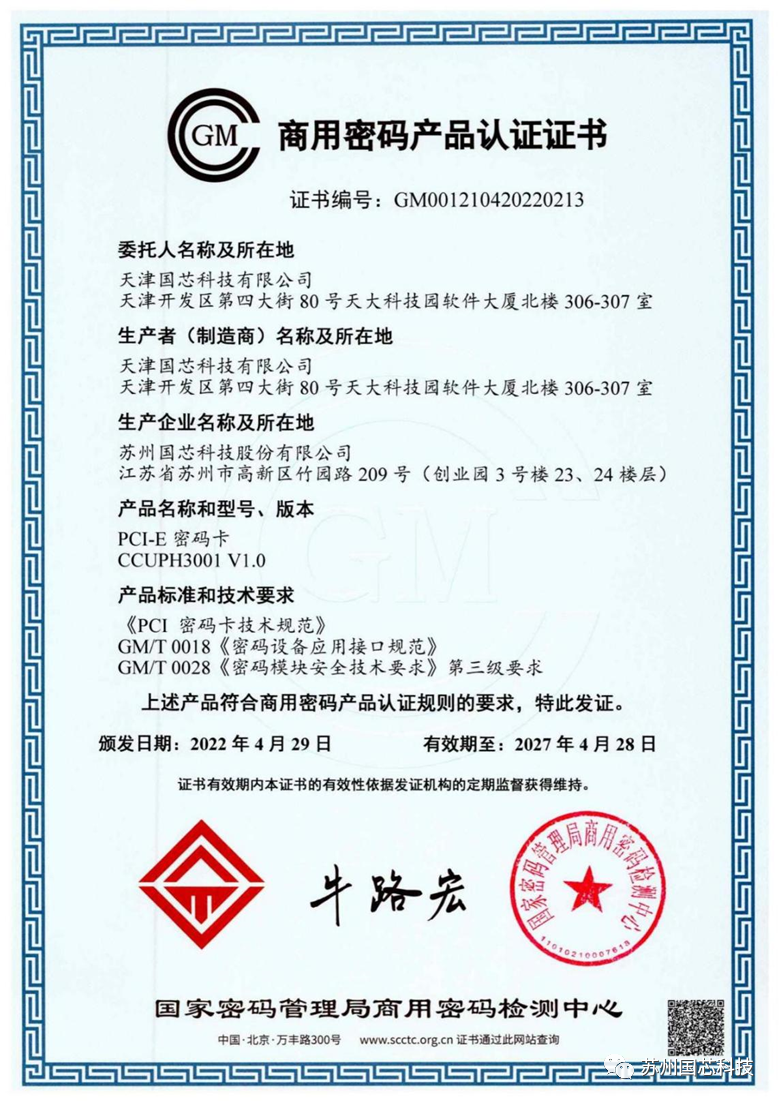 国芯科技基于上述云安全系列高速密码芯片设计的高速PCI-E密码卡系列产品,采用全国产化SoC方案,不需要额外的FPGA芯片;遵循国家密码管理局密码卡PCI-E卡技术规范,提供国密标准API接口(基于GMT 0018密码设备应用接口规范,支持SM2、SM3、SM4等国密算法),已获得国家密码管理局商用密码检测中心颁发的商密产品认证证书,达到《密码模块安全技术要求》第三级要求。