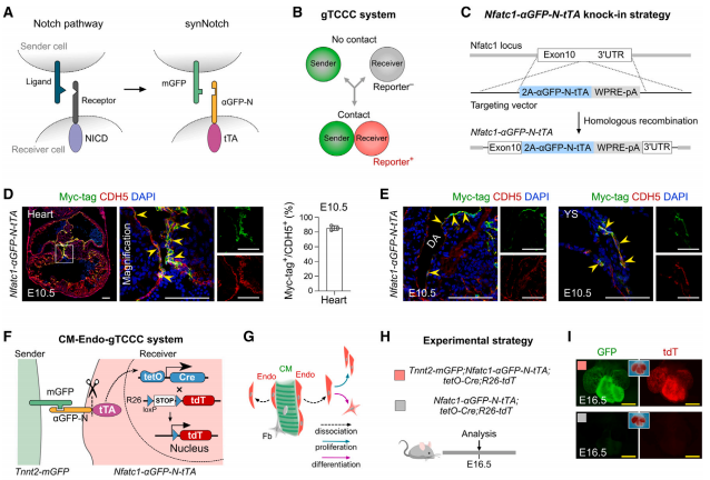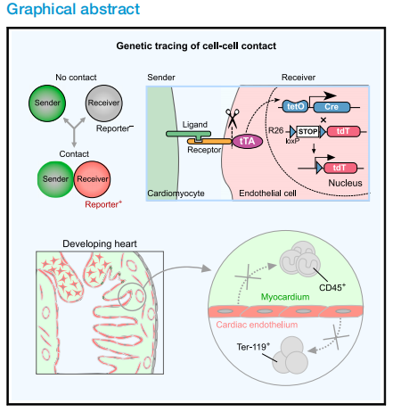 心肌细胞表达synNotch配体,内皮细胞表达synNotch受体,当心肌细胞与内皮细胞发生细胞接触,synNotch配体与受体就会结合并引起胞内段tTA入核结合到tetO启动子,激活Cre的表达并介导Cre-loxP重组,最终将受体细胞(心脏内皮细胞)高效、特异性标记为tdT。对tdT+内皮细胞进行遗传谱系示踪,揭示心脏内皮细胞并不具备造血活性,心内膜细胞在心脏发育过程中主要是形成冠状血管内皮细胞。