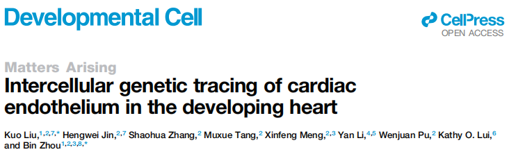 6月22日,国际学术期刊Developmental Cell在线发表了国科大杭州高等研究院生命与健康学院/中国科学院分子细胞科学卓越创新中心周斌研究组合作研究成果“Intercellular Genetic Tracing of Cardiac Endothelium in the Developing Heart”。该研究结合合成生物学与体内遗传学技术,创建了研究心脏发育的邻近细胞谱系示踪新工具。利用该技术,研究人员重新阐明心脏早期发育过程中心内膜及冠状动脉发育谱系建立,并发现心脏内皮细胞在正常发育过程中并不具有造血功能,而是形成冠状血管内皮细胞。该工作为人们更清楚地了解心脏早期发育、心脏免疫细胞起源及临床心脏损伤修复提供研究基础,也为体内邻近细胞研究提供重要技术指导。