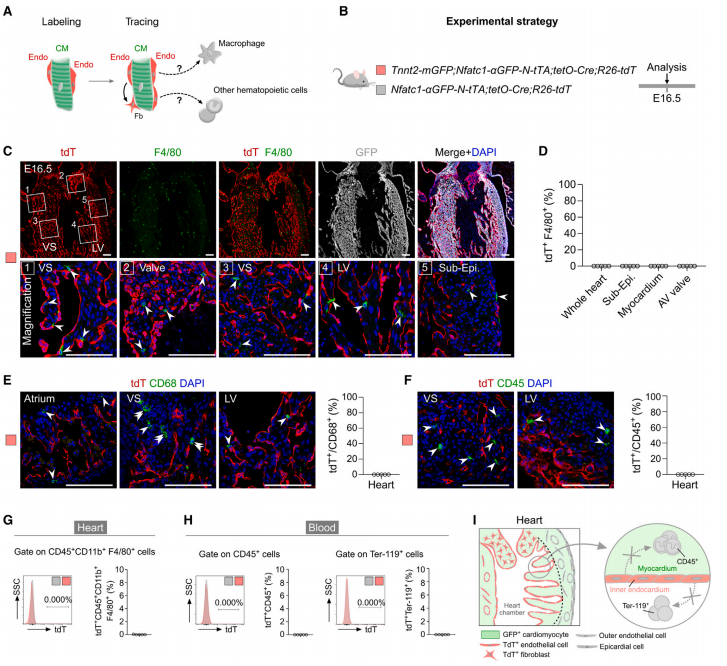首先研究人员利用已构建的Tnnt2-mGFP工具小鼠使心肌细胞表达synNotch配体,又构建了Nfatc1+细胞特异性表达synNotch受体的工具小鼠Nfatc1-αGFP-N-tTA(Nfatc1-antiGFP nanobody-Notch transmembrane domain-tTA)。研究发现在Nfatc1-αGFP-N-tTA中,Nfatc1除了在心内膜细胞表达,还表达在两种已知的卵黄囊(YS)和主动脉-性腺-中肾区(AGM)生血内皮细胞中,说明Nfatc1并不是心内膜特异性分子标记。然而在Tnnt2-mGFP;Nfatc1-αGFP-N-tTA;tetO-Cre;R26-tdT (CM-Endo-gTCCC)小鼠中,由于Tnnt2特异性表达在心肌细胞,所以只有与Tnnt2+心肌细胞接触的Nfatc1+内皮细胞才会激活synNotch信号,从而对受体细胞进行遗传标记。研究人员收取E16.5 CM-Endo-gTCCC胚胎并验证只有心脏内侧的Nfatc1+心内膜细胞被tdT标记示踪,免疫荧光染色及流式细胞分析显示这些被标记的心内膜并不会分化为心脏驻留型免疫细胞或外周血细胞,这些心内膜细胞主要分化形成冠状血管内皮细胞。