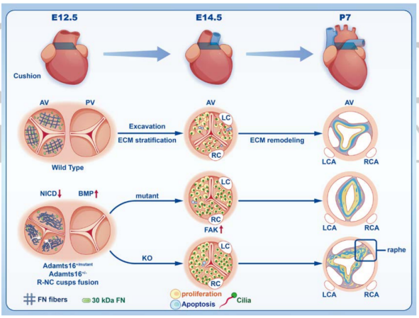 该研究探讨了ADAMTS家族成员在主动脉瓣发育和BAV形成中的作用。ADAMTS16缺陷介导的BAV在胚胎早期形成,随后在后期逐渐产生脊异常,构成了一个与BAV疾病自然历史相关的连续体。细胞外基质重构中断伴随fibronectin/FAK信号介导的细胞过度增殖是BAV形成和脊异常的关键机制,可能是治疗BAV相关瓣膜病和主动脉病变的重要治疗靶点。总之,该研究发现了一种新的引起BAV的ADAMTS16 p. H357Q变体。ADAMTS16缺乏导致BAV的形成。