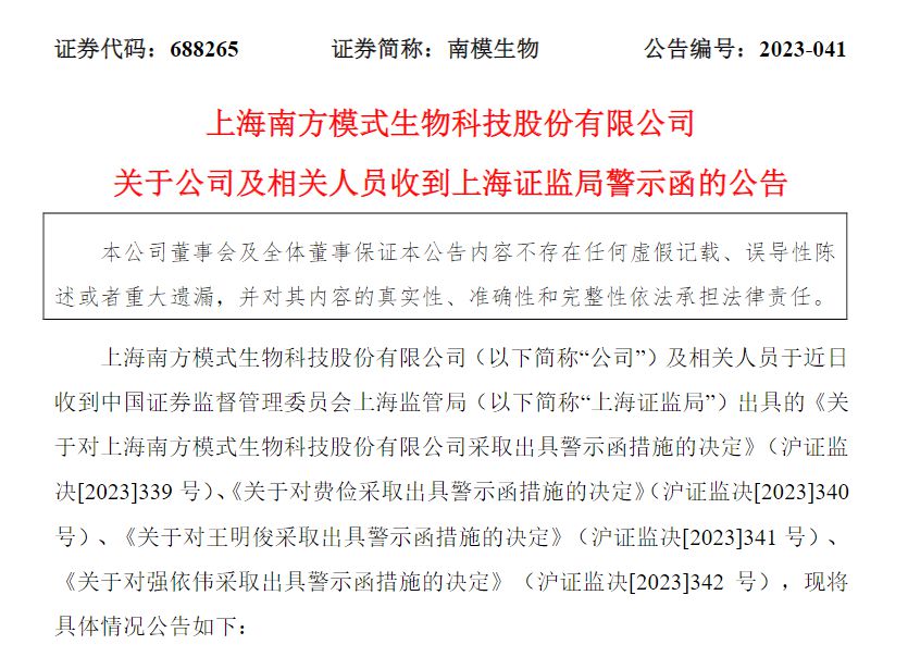 上海证监局决定对南模生物采取出具警示函的监督管理措施。