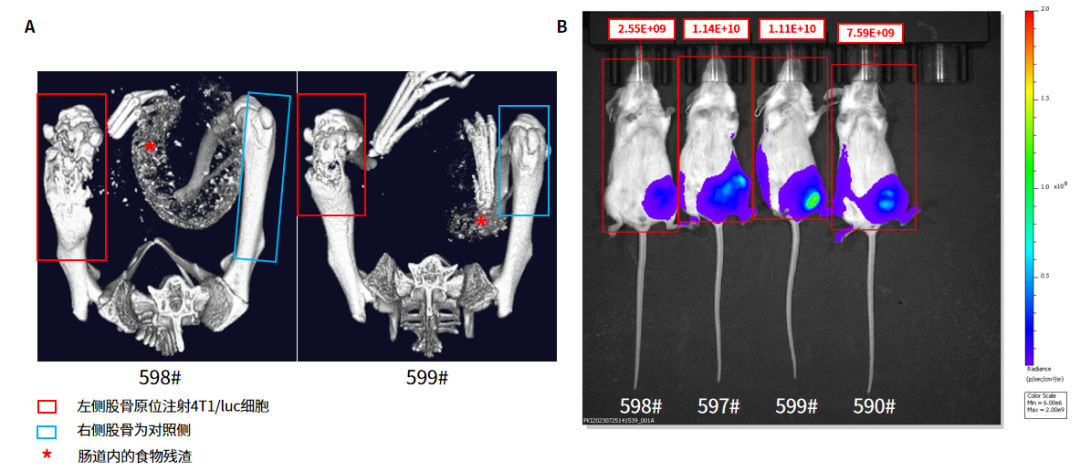 (A)左侧股骨原位接种4T1/luc细胞25天后的micro CT图像;(B)左侧股骨原位接种4T1/luc细胞25天后的IVIS图像以及荧光值。