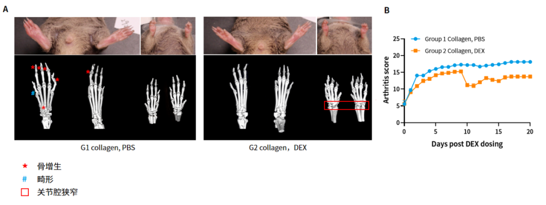 (A)CIA关节炎模型注射DEX/PBS 25天后的micro CT图像;(B)CIA关节炎模型的关节炎前后爪总评分。