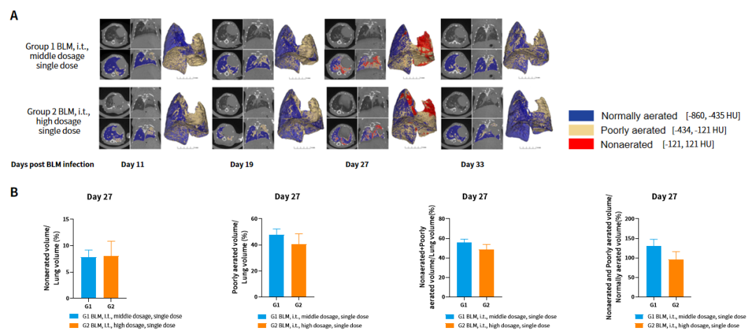 (A)不同剂量的博来霉素诱导肺纤维化小鼠的micro CT图像;(B)不同剂量的博来霉素诱导肺纤维化小鼠在Day 27时的正常通气区域,低通气区域和不通气区域的百分比。