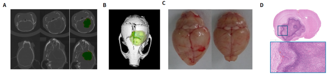 (A-B)U87细胞接种脑原位肿瘤模型小鼠注射造影剂之后的micro CT图像;(C)U87细胞接种脑原位肿瘤模型小鼠的脑肿瘤图片(左)与正常脑组织照片(右);(D)U87细胞接种脑原位肿瘤模型小鼠的脑组织H E染色图,100X。