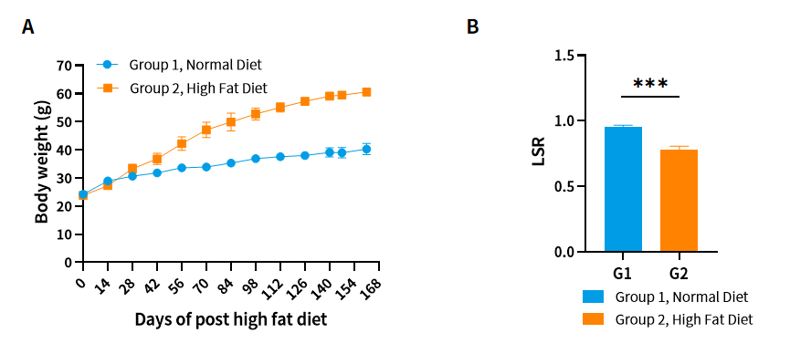 7月龄C57小鼠,经过6个月的高脂饮食/正常饮食之后扫描micro CT。(A)脂肪肝小鼠的体重;(B)脂肪肝小鼠的LSR值。