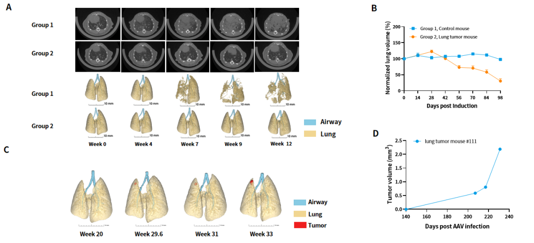 (A-B)Stk11-Flox/R26-CAG-LSL-Luc-2A-EGFP/Kras-LSL-G12D自发肺癌小鼠以及对照小鼠的micro CT图像和功能性肺体积曲线,此基因小鼠自发肿瘤多为弥漫性结节;(C-D)Rb1-Flox/Trp53-Flox/R26-CAG-LSL-Luc-2A-EGFP自发肺癌小鼠的micro CT图像和肿瘤生长曲线,此基因小鼠自发肿瘤多为边界清晰的独立结节。
