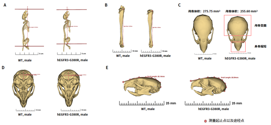 (A)FGFR3-G374R小鼠的全身骨骼影像以及体长;(B)FGFR3-G374R小鼠的胫骨影像以及股骨长度;(C)FGFR3-G374R小鼠的颅骨影像以及颅骨体积;(D)FGFR3-G374R小鼠的枕骨大孔影像以及长度和宽度;(E)FGFR3-G374R小鼠颅骨影像以及颅骨长度。