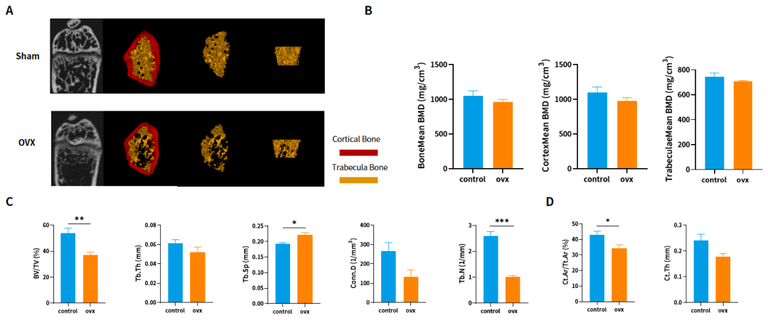 (A)骨质疏松模型假手术组(sham)和手术组(OVX)的CT影像和伪彩影像;(B)股骨的密度参数;(C)股骨骨小梁结构性参数以及密度参数;(D)皮质骨结构性参数。