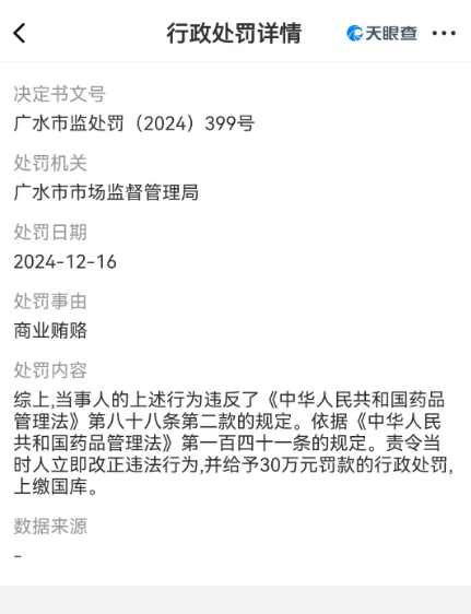 据信息显示,就在2024年底,湖北省广水市市场监管局以商业贿赂的事由对上市公司主体苏州泽璟生物制药股份有限公司处以30万元的罚款处罚(处罚文书号广水市监【2024】399号)。