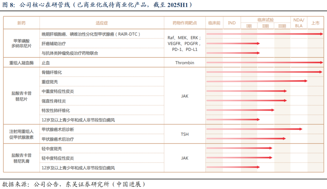 差异化管线布局、层次性推进研发进展,保障商业化优势及未来持续竞争力。公司在研管线丰富,截至2025H1,共计15项主要在研药品,涵盖双抗、三抗、重组蛋白药物及小分子化药。其中3款已获批上市产品(甲苯磺酸多纳非尼片晚期肝癌/RAIR-DTC、重组人凝血酶、盐酸吉卡昔替尼片MF)、1款BLA产品(rhTSH甲状腺癌术后诊断);2款产品的4项适应症处于Ⅲ期临床(盐酸吉卡昔替尼3项自免适应症、rhTSH甲状腺癌术后治疗);多款产品处于Ⅰ期或Ⅱ期临床试验阶段。