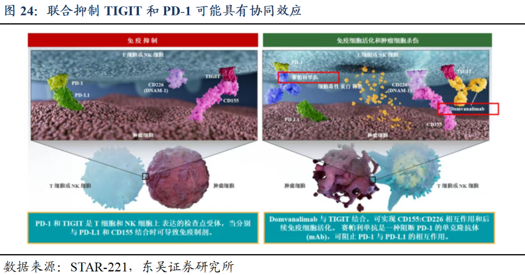 TIGIT单一阻断效果有限,多与PD-1/PD-L1联用。由于TIGIT单药治疗有局限性,且TIGIT受体在T细胞及NK细胞表达,同时靶向PD-1及TIGIT受体,具有更好抗肿瘤协同作用,因此目前全球涉及TIGIT的临床研究中,多为与PD-1/PD-L1联用,包括1)同时给药抗TIGIT和抗PD-1/PD-L1药物(例如tiragolumab+atezolizumab)。2)联合使用抗TIGIT和抗PD-1/PD-L1药物(如MK-7684A)。3)结合TIGIT和PD-1/PD-L1的双特异性抗体(如IBI321)。