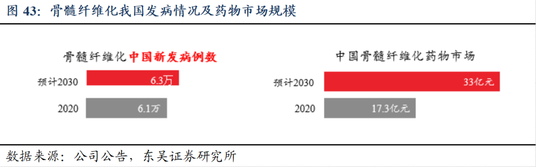 骨髓纤维化(MF)存在未被满足的临床需求。根据弗若斯特沙利文,预计2030年国内骨髓纤维化患者年新发6.3万,存量患者数预计约30万人,靶向药市场的临床可惠及人口渗透率将达到30.7%。目前针对骨髓纤维化的治疗药物有限,以对症支持治疗为主。全球范围内仅有芦可替尼、菲达替尼和帕瑞替尼三款靶向药物获批用于骨髓纤维化,在国内仅有芦可替尼上市。2025年5月29日,公司盐酸吉卡昔替尼片MF适应症获批上市,有望迅速占据国内市场份额。