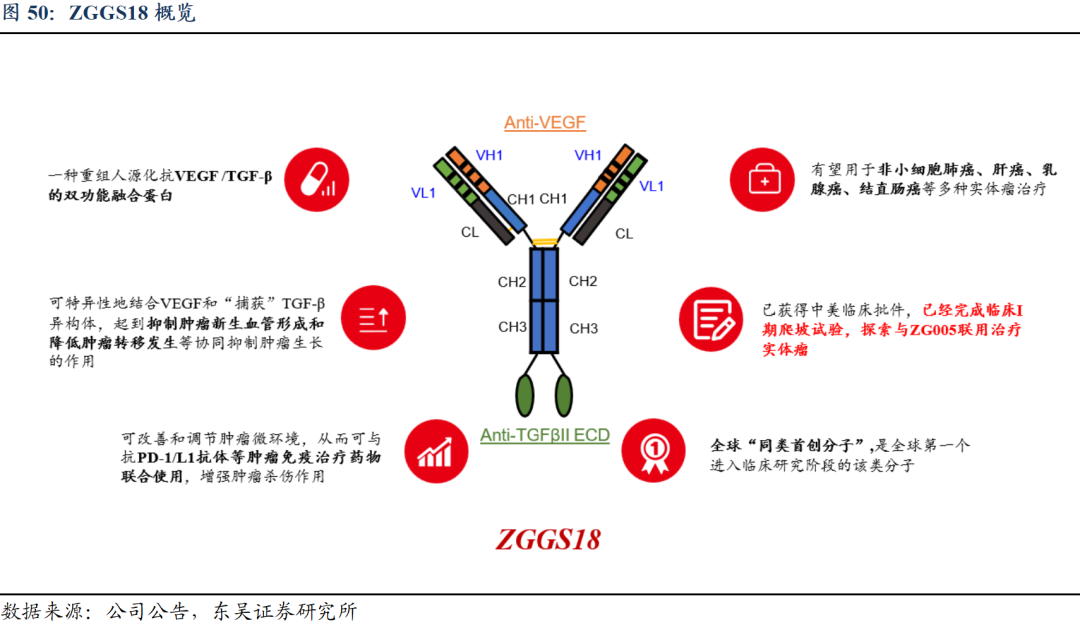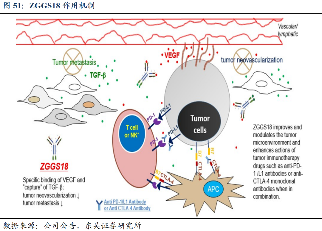 独特的作用机制:改善肿瘤微环境,增强肿瘤免疫抗肿瘤疗效。ZGGS18的双靶点作用能够同时减少肿瘤微环境中的VEGF和/或TGF-β,可以恢复肿瘤对肿瘤特异性细胞疗法的敏感性,并可能改善抗PD-1/ZG005/抗CTLA-4治疗的疗效。