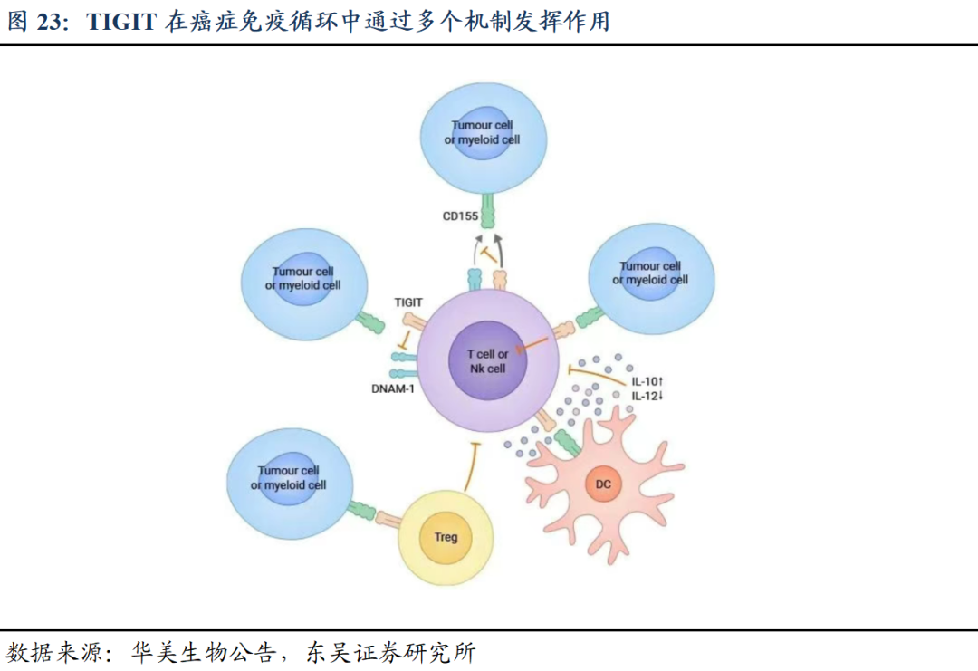 TIGIT是一种重要的免疫检查点分子,具有一个免疫球蛋白样域和一个免疫受体酪氨酸抑制基序(ITIM),属于免疫球蛋白超家族。TIGIT在NK细胞、T细胞和树突状细胞(DCs)上表达,TIGIT的主要功能是通过与其配体CD155和CD112的相互作用来传递抑制信号,抑制T细胞和NK细胞的活化和效应功能,减少炎症反应和免疫应答,同时帮助肿瘤细胞逃避免疫监视。通过阻断TIGIT与其配体的结合,可以恢复或增强T细胞和NK细胞的抗肿瘤活性,从而提高免疫治疗的效果。因此,TIGIT成为了癌症免疫治疗的一个新兴靶点。