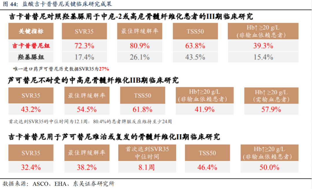 盐酸吉卡昔替尼片有望成为BIC药物。在《CSCO恶性血液病诊疗指南(2024年)》纳入了原发性骨髓纤维化(PMF)一线分层治疗的I级推荐,并维持二线及进展期治疗的推荐,尤其是在骨髓纤维化(MF)相关贫血患者的一线治疗中,被列为I级推荐的首选。公司正在美国开展复发难治性MF的I期临床试验,并获得FDA孤儿药资格。此外,盐酸吉卡昔替尼片受广泛认可,专利保护期长。此外,吉卡昔替尼关键指标改善程度显著高于其他已上市药物的临床试验数据,展现BIC潜力。