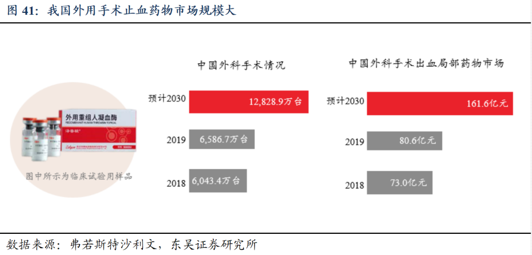 我国外用手术止血药物市场规模大,尚无同类产品上市。根据弗若斯特沙利文,预计我国到2030年外科手术约1.28亿台,对应外科手术出血局部药物市场为161.6亿元。