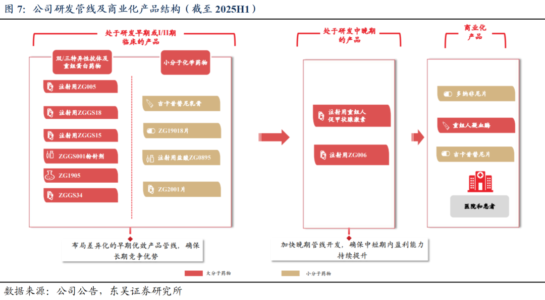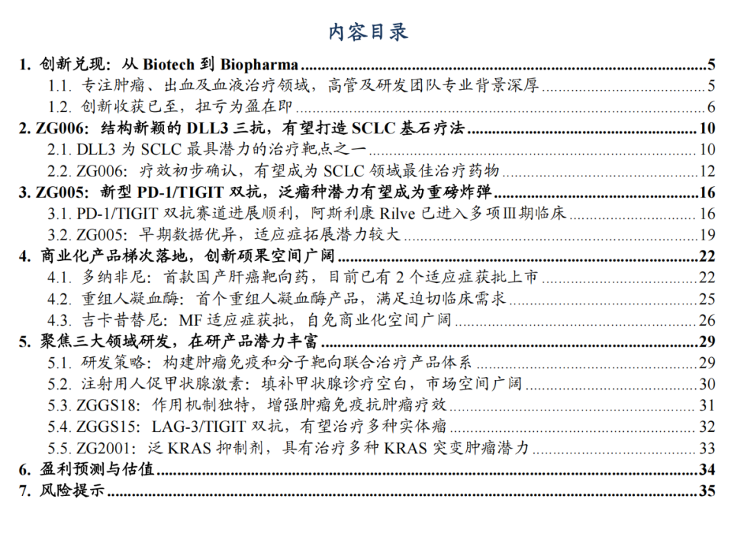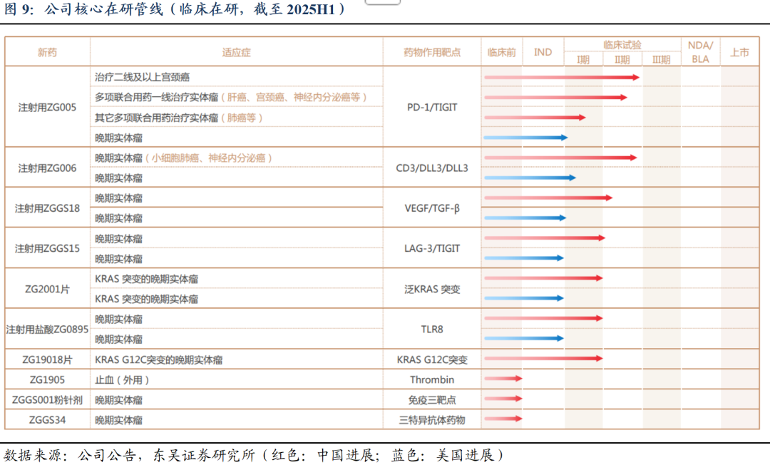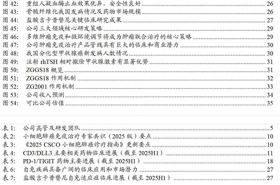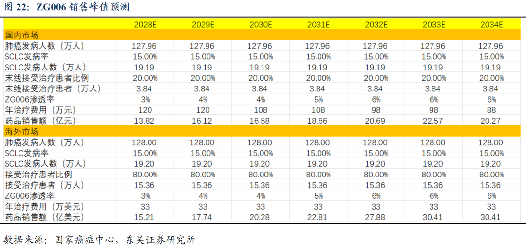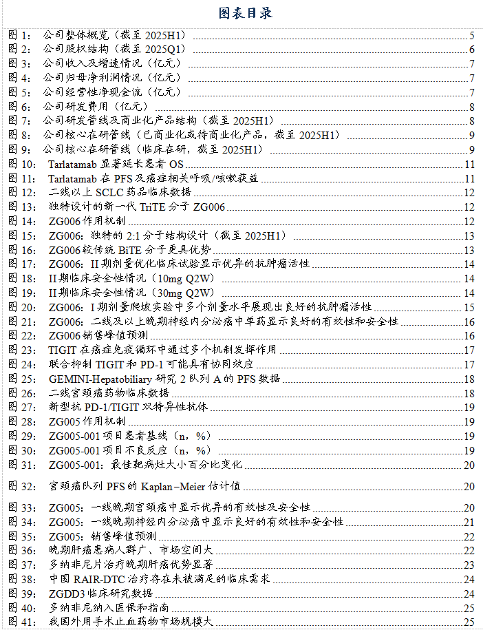 ZG006(CD3/DLL3/DLL3)疗效数据优异,打造小细胞肺癌基石疗法:ZG006为结构新颖的DLL3三抗,2025ASCO数据亮眼,针对三线及以上SCLCⅡ期剂量优化试验中,10mg与30mg组ORR分别为62.5%和58.3%,DCR分别为70.8%和66.7%。此外在神经内分泌癌患者中也展现显著抗肿瘤活性及良好的安全性。未来 ZG006针对后线SCLC及一线联合都将开展注册临床,全面布局小细胞肺癌赛道,打造基石疗法。海外临床获得FDA同意,有望近期入组患者。我们预计ZG006小细胞肺癌适应症国内销售峰值约20亿人民币、海外销售峰值约30亿美金,由于产品创新性强,初步数据优异,海外授权潜力较大。