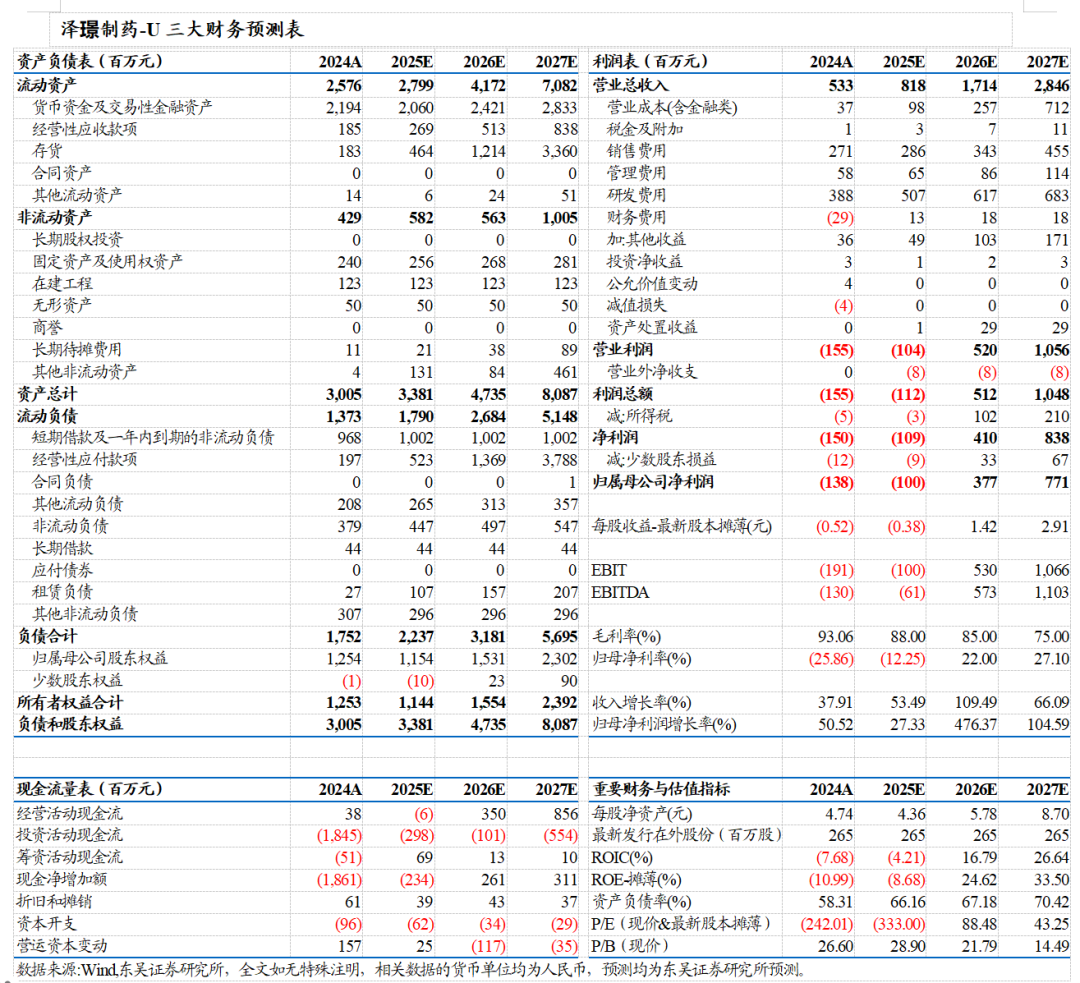 2)毛利率预测:考虑公司2025年为核心管线商业化关键阶段,2026年开始销售迅速放量,销售成本增加,预计2025-2027年毛利率为88%、85%、75%。