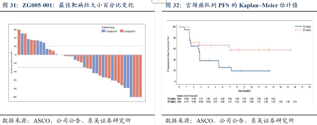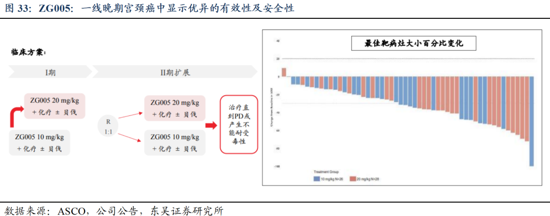 ASCO披露详细II期数据,初步疗效已验证,早期数据优异且适应症拓展潜力较大,有望成为下一个重磅品种。ZG005针对宫颈癌二三线已完成所有患者入组,III期双抗头对头注册临床方案和CDE沟通中;一线肝癌II期同步推进中,初步疗效信号较好;联合JAK开发PD1/PDL1经治的非小细胞肺癌获批临床,适应症开发潜力较大。