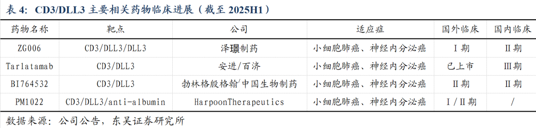 安进的CD3/DLL3双抗塔拉妥单抗(Tarlatamab)针对末线SCLC患者临床试验的疗效突出,使得后线患者mOS由8个月提高至14.3个月,因而于2024年5月获得美国FDA加速批准上市;紧随其后为勃林格殷格翰/中国生物制药的CD3/DLL3双抗(国内外均为Ⅱ期)、公司的CD3/DLL3/DLL3三抗(国内Ⅱ期、国外Ⅰ期)。除了双抗/三抗之外,再鼎医药以及百利天恒的 DLL3 ADC、传奇生物的DLL3 CAR-T 等均已步入临床阶段。