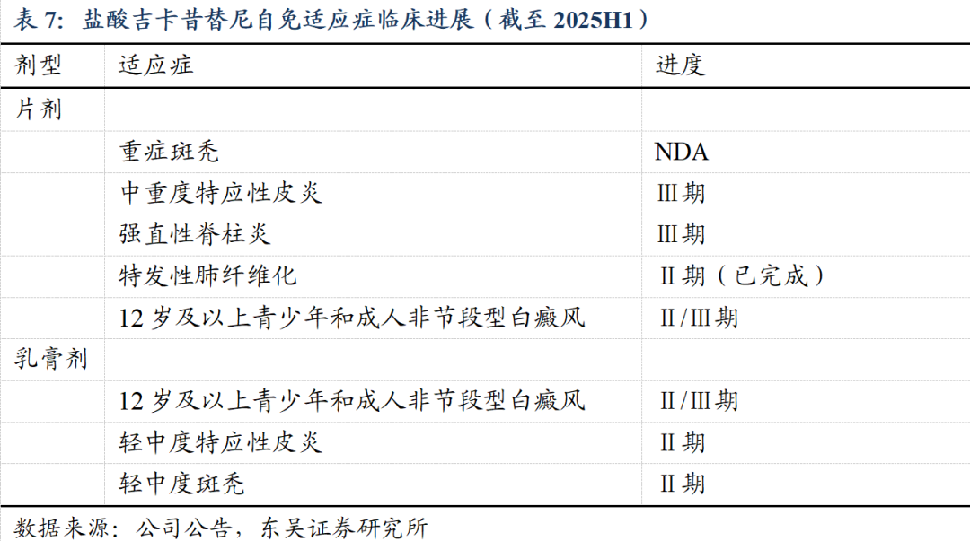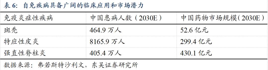 自免疾病市场规模庞大,公司吉卡昔替尼斑秃、特应性皮炎、强直性脊柱炎适应症均已进入Ⅲ期临床。据弗若斯特沙利文,我国2030年斑秃、特应性皮炎、强直性脊柱炎药物市场规模有望达52.6/299.4/430.1亿元。