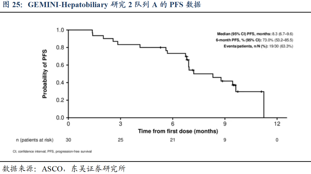 1)截至2024年11月4日,共30例患者接受了治疗,中位年龄为60岁,70.0%为亚洲人群,83.3%为转移性疾病。Rilvegostomig中位治疗周期数为10.5次,36.7%的患者仍在接受rilvegostomig治疗。吉西他滨/顺铂的治疗中位周期数均为8次,30%的患者仍在接受化疗。中位随访6.9个月时,6个月PFS率达73.0%(95%CI:53.2-85.5),中位PFS为8.3个月(95%CI:6.7-9.6)。OS数据尚未成熟(中位随访9.8个月时),9个月OS率为85.0%(95%CI:64.6-94.2)。