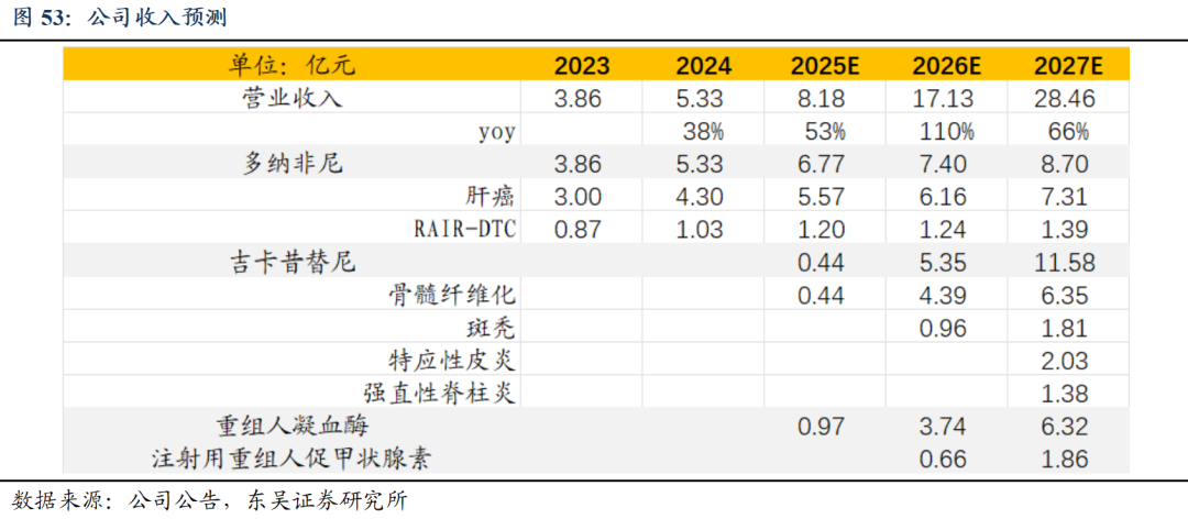 1)多纳非尼:多纳非尼为目前针对肝癌一线治疗和晚期分化型甲状腺癌(RAIR-DTC)治疗的核心药物,已上市2-3年,预计多纳非尼整体销售峰值可达10亿,预计2025-2027年收入6.77、7.40、8.70亿元。