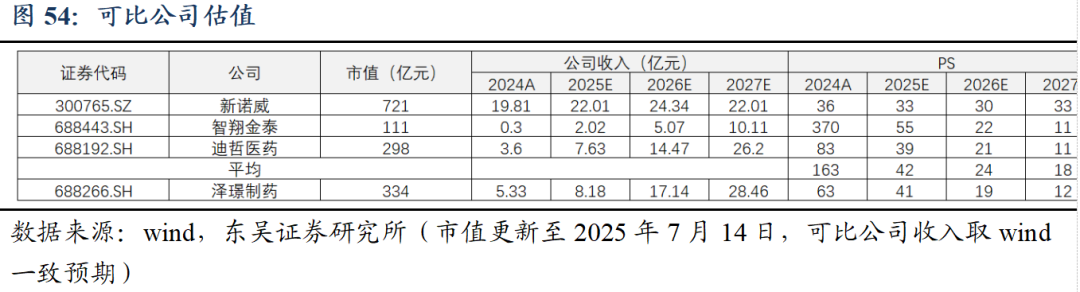 综上,我们预计公司2025-2027年收入分别为8.18/17.14/28.46亿元,归母净利润分别为-1.00/3.77/7.71亿元。考虑公司目前处于创新商业化兑现初期,部分核心管线上市时间较短,国内销售初步放量,我们选取PS相对估值法。