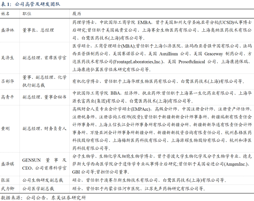 高管及研发团队专业背景深厚,在新药研发领域经验丰富。公司创始人、董事长兼总经理盛泽林于美国迈阿密大学取得药理学博士学位,曾任职于美国施贵宝公司、上海赛金生物、上海奥纳医药、白鹭医药等多家药企。此外公司多名核心技术人员均具有海内外知名药企的新药研发经验,专业背景深厚。