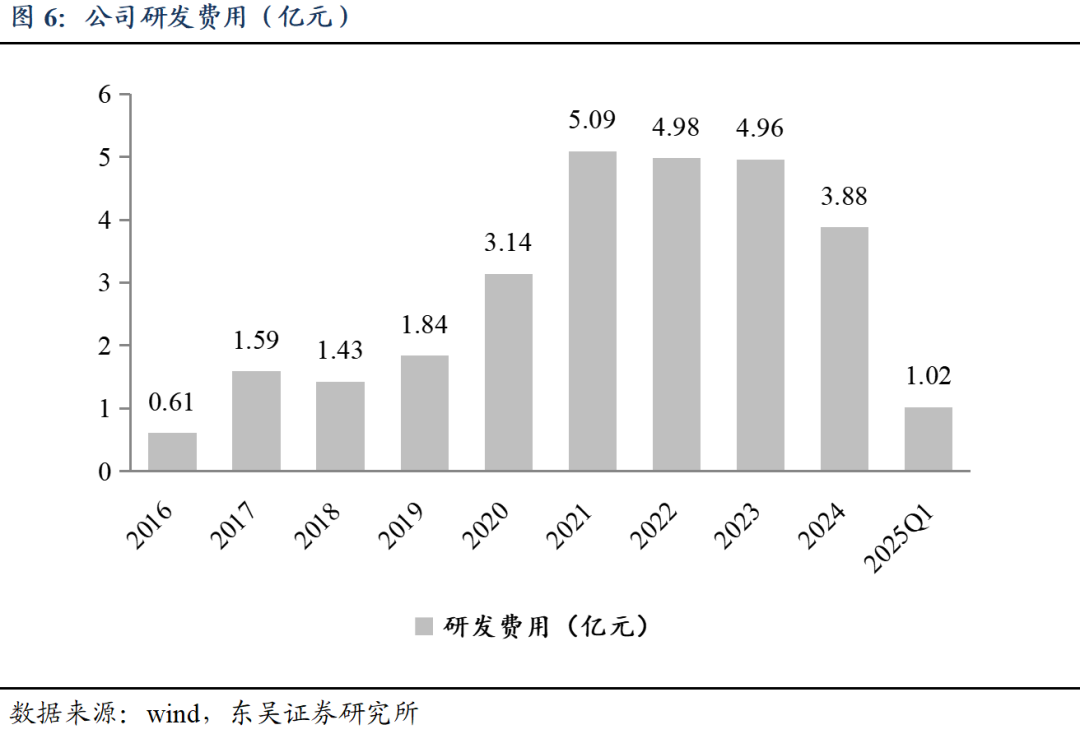 公司研发费用由2016年的0.61亿元增长至2023年的4.96亿元,2024年降低至3.88亿元,原因系具体研发项目所处不同研发阶段,整体研发费用同比有所减少。预计未来随着研发管线持续推进,公司将持续投入研发费用,加速创新兑现。