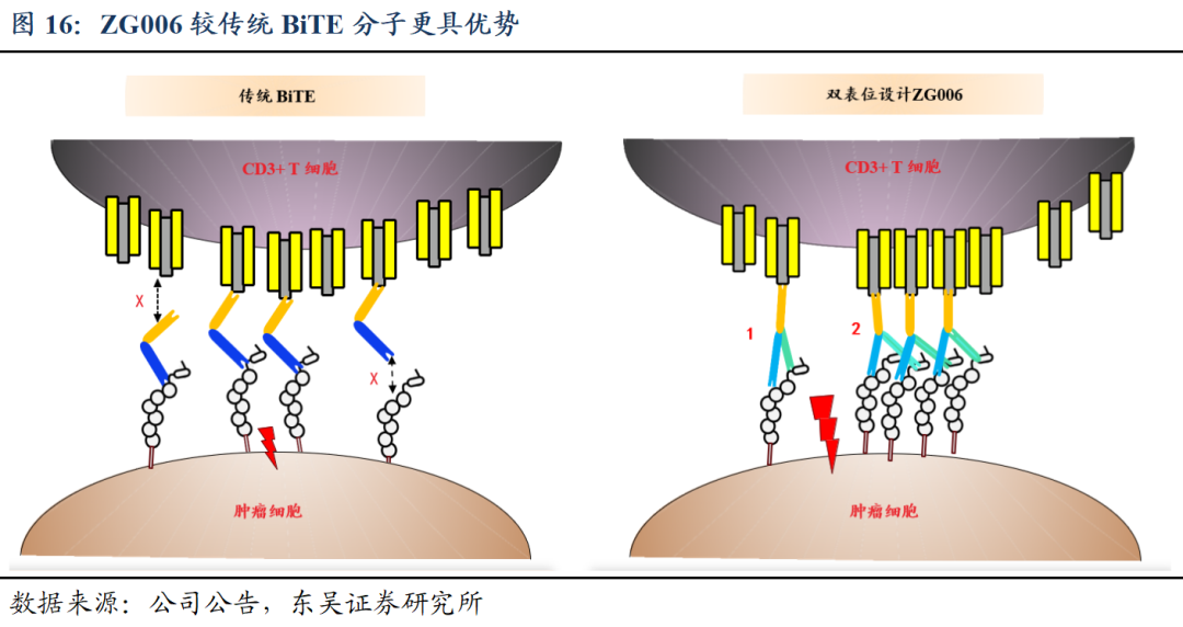 ZG006较传统BiTE分子更具优势。传统BiTE有时较难形成稳定的免疫突触,尤其是在DLL3低表达环境中,因此具备局限性;而ZG006可以结合在一个DLL3分子的两个表位上(紧密结合)或是结合在不同DLL3分子的两个表位上(聚集效应),起到协同作用从而形成稳定的免疫突触,并且增加结合强度。
