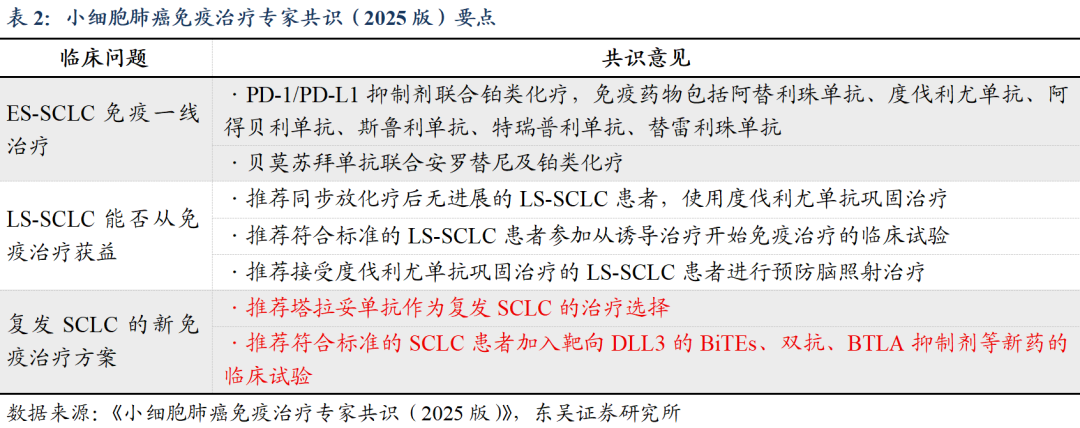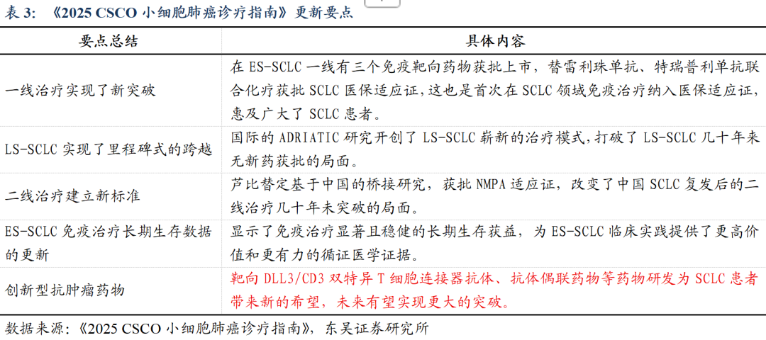 DLL3作为创新型抗肿瘤药物已成专家共识。《小细胞肺癌免疫治疗专家共识(2025版)》指出,对于复发SCLC的新免疫治疗方案中,推荐符合标准的SCLC患者加入靶向DLL3的BiTEs、双抗、BTLA抑制剂等新药的临床试验;《2025 CSCO小细胞肺癌诊疗指南》提及靶向DLL3/CD3双特异T细胞连接器抗体、抗体偶联药物等药物研发为SCLC患者带来新的希望,未来有望实现更大的突破。