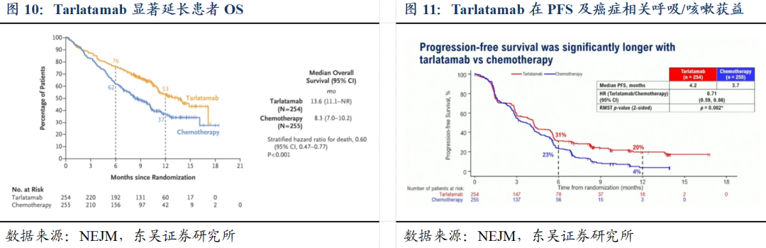 他山之石:塔拉妥单抗于2025ASCO大会上口头报告其Ⅲ期临床结果,显示OS获益。针对DeLLphi-304临床试验(多国、III期、开放标签的临床试验,比较Tarlatamab与化疗在小细胞肺癌患者中作为二线治疗的效果),共有509名患者被随机分配至Tarlatamab组(254人)或化疗组(255人)。Tarlatamab显著延长了患者的总生存期(中位OS为13.6个月,化疗组为8.3个月;分层死亡风险比为0.60;95%置信区间为0.47至0.77;P 0.001)。与化疗相比,Tarlatamab在无进展生存期及癌症相关的呼吸困难和咳嗽方面也表现出显著获益。3级及以上不良事件的发生率在Tarlatamab组低于化疗组(54%vs.80%),因不良事件导致停药的发生率也较低(5%vs.12%)。