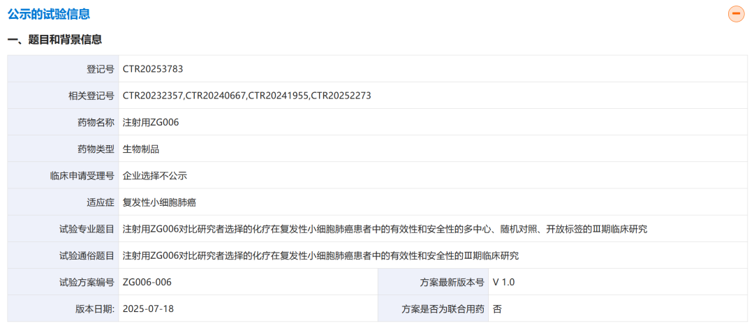 基于以上积极数据,ZG006在今年7月被CDE纳入突破性治疗品种名单,适应症为ZG006单药治疗既往经含铂化疗及至少1种其它系统治疗后(三线及以上)复发或进展的晚期SCLC患者。