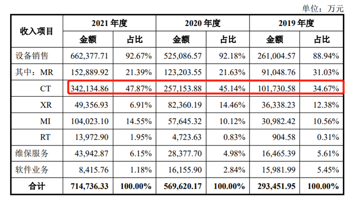 透视联影招股书,CT业务是其目前营收占比最高的业务,2021年已经能够占到公司总营收的47.87%。同时,CT业务也是联影营收增速最快的业务,2020年和2021年的增速高达153%和33%,成为公司近年业绩增长的核心驱动力。除CT业务一枝独秀外,联影医疗的MR业务和MI业务分别占2021年总营收的21.39%和14.55%。