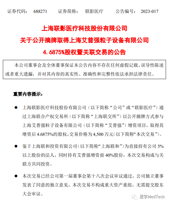 2023年6月20日,联影医疗(688271.SH)发布公告称,公司通过上海联合产权交易所(以下简称“上海联交所”)以公开摘牌方式参与上海艾普强粒子设备有限公司(以下简称“艾普强”)增资项目,取得后者增资后4.69%的股权,交易价格为4500万元。