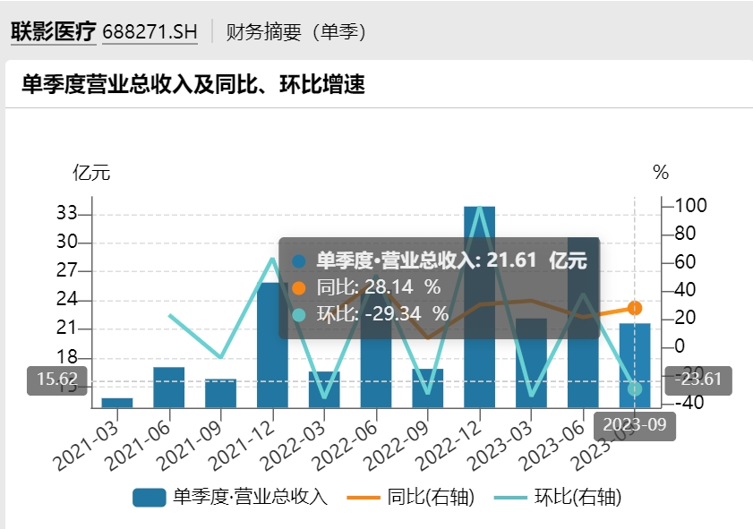 单季度来看,联影医疗第三季度营收21.61亿元,同比增长28.14%;归母净利润1.27亿元,同比增长1.23%;归母扣非净利润4175.81万元,同比增长29.46%。wind数据显示,联影医疗第三季度营收环比下降29.34%,净利润环比下降79.2%。