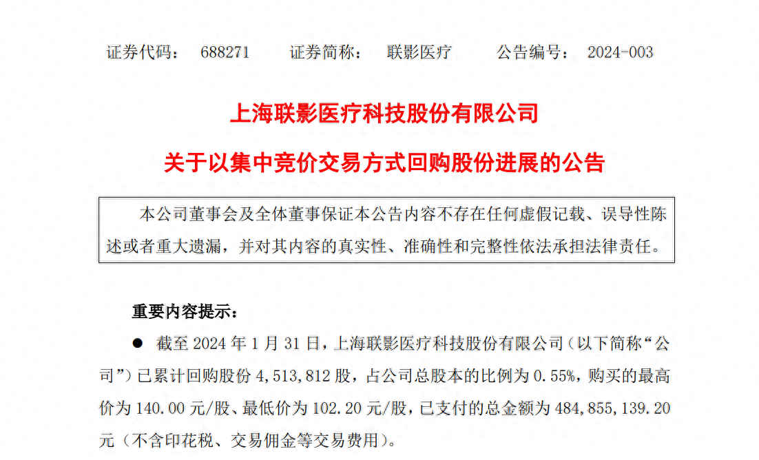 2月1日,联影医疗(688271.SH)发布关于以集中竞价交易方式回购股份进展的公告。