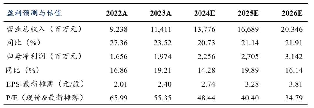 段落提要:2023年公司实现营业收入114.11亿元(+23.52%,同比,下同),实现归母净利润19.74亿元(+19.21%)。2024年一季度公司实现营业收入23.50亿元(+6.22%),实现归母净利润3.63亿元(+10.20%),业绩符合我们预期。
