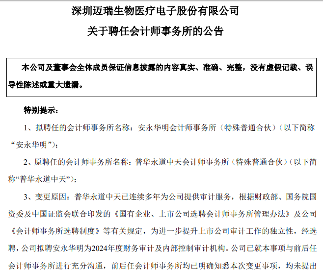 此前,5月24日,迈瑞医疗发布公告,将已聘任九年的普华永道变更为安永华明,成为业内首家与普华永道解约的医械厂商。
